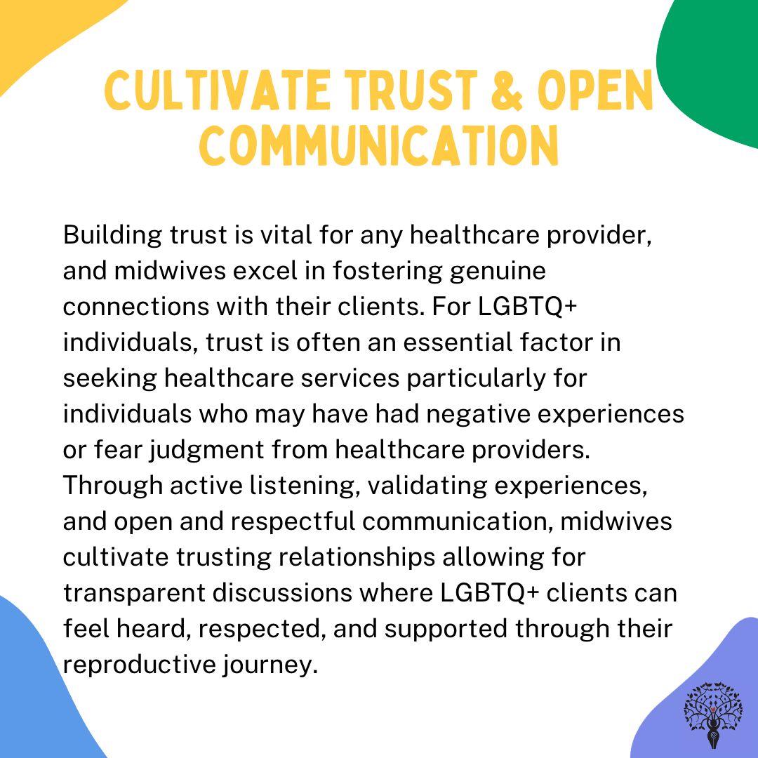 3. Building trust is vital for any healthcare provider, and midwives excel in fostering genuine connections with their clients. For LGBTQ+ individuals, trust is often an essential factor in seeking healthcare services, particularly for individuals who may have had negative experiences or critical judgment from healthcare providers. Through active listening, validating experiences, and open and respectful communication, midwives cultivate trusting relationships allowing for transparent discussions where LGBTQ+ clients can feel heard, respected, and supported through their reproductive journey.