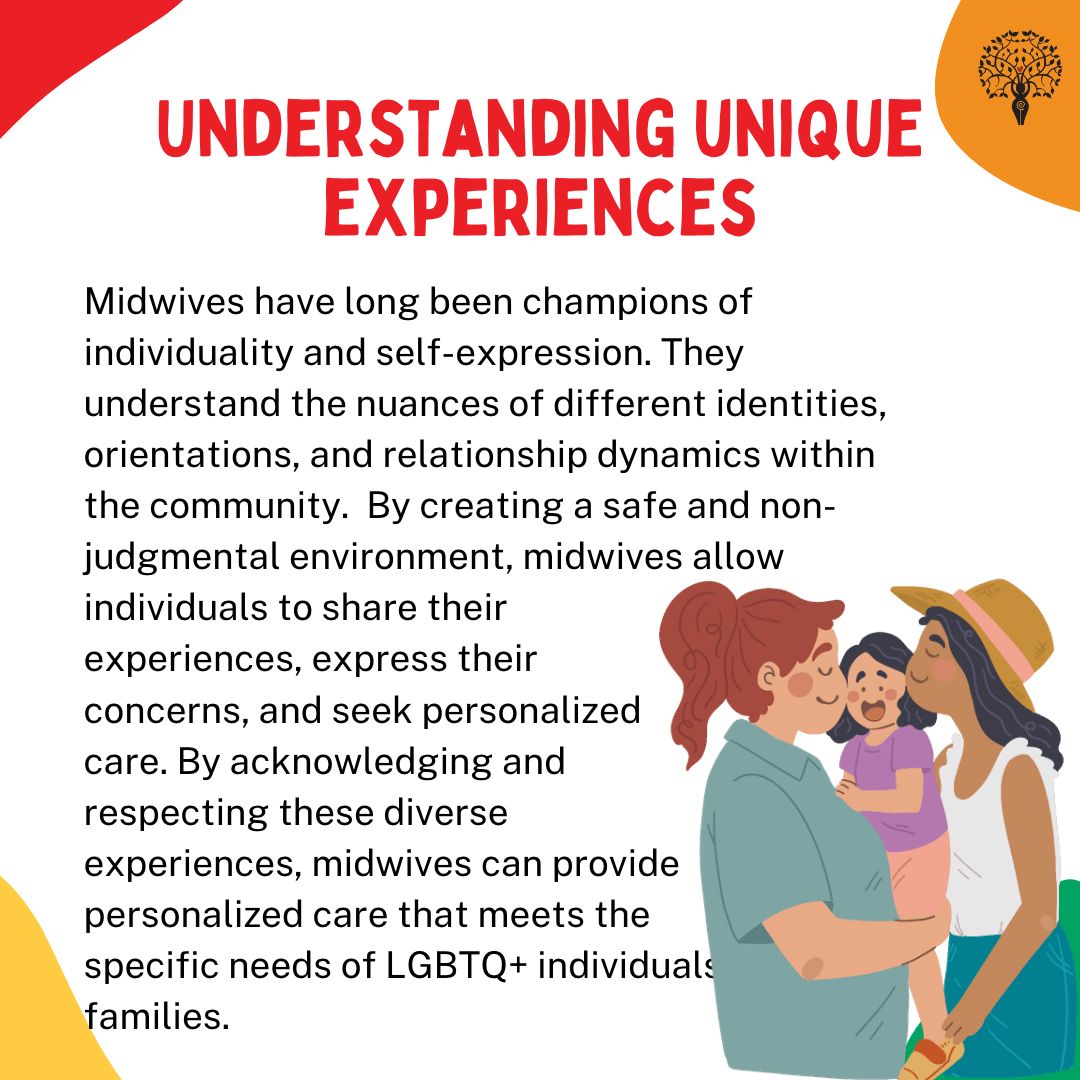 1. Midwives have long been champions of individuality and self-expression. They understand nuances of different identities, orientations, and relationship dynamics within the community. By creating a safe, and non-judgmental environment, midwives allow individuals to share their experiences, express their concerns, and seek personalized care. By acknowledging and respecting these diverse experiences, midwives can provide personalized care that meets the specific needs of LGBTQ+ individuals and families.