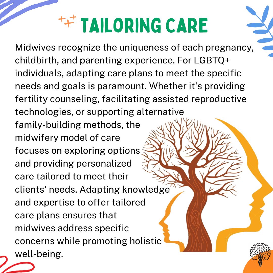 4. Midwives recognize the uniqueness of each pregnancy, childbirth, and parenting experience. For LGBTQ+ individuals, adapting care plans to meet the specific needs and goals is paramount. Whether it’s providing fertility counseling, facilitating assisted reproductive technologies, or supporting alternative family-building methods, the midwifery model of care focuses on exploring options and providing personalized care tailored to meet their clients’ needs. Adapting knowledge and expertise to offer tailored care plans ensures that midwives address specific concerns while promoting holistic well-being.