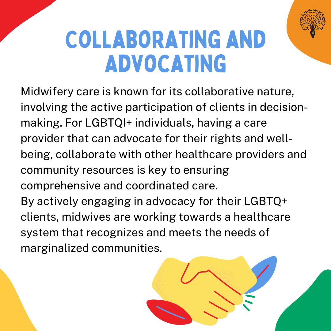 5. Midwifery care is known for its collaborative nature, involving the active participation of clients in decision-making. For LGBTQI+ individuals, having a care provider that can advocate for their rights and well-being, collaborate with other healthcare providers and community resources is key to ensuring comprehensive and coordinated care. By actively engaging in advocacy for their LGBTQ+ clients, midwives are working towards a healthcare system that recognizes and meets the needs of marginalized communities.