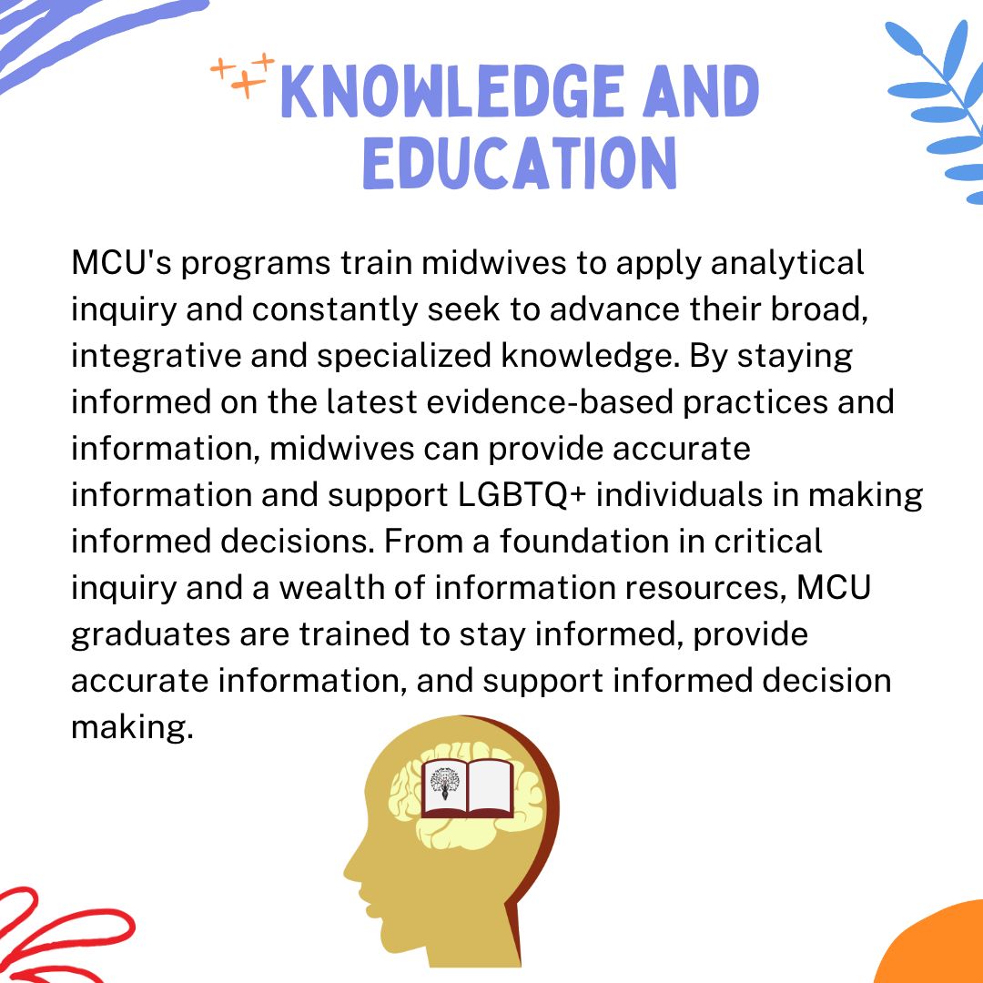 6. MCU’s programs train midwives to apply analytical inquiry and constantly seek to advance their broad, integrative, and specialized knowledge. Midwives provide accurate information and support LGBTQ+ individuals in making informed decisions by staying up-to-date on the latest evidence-based practices. From a foundation in critical inquiry and a wealth of information resources, MCU graduates dispense accurate information, and support shared decision making.